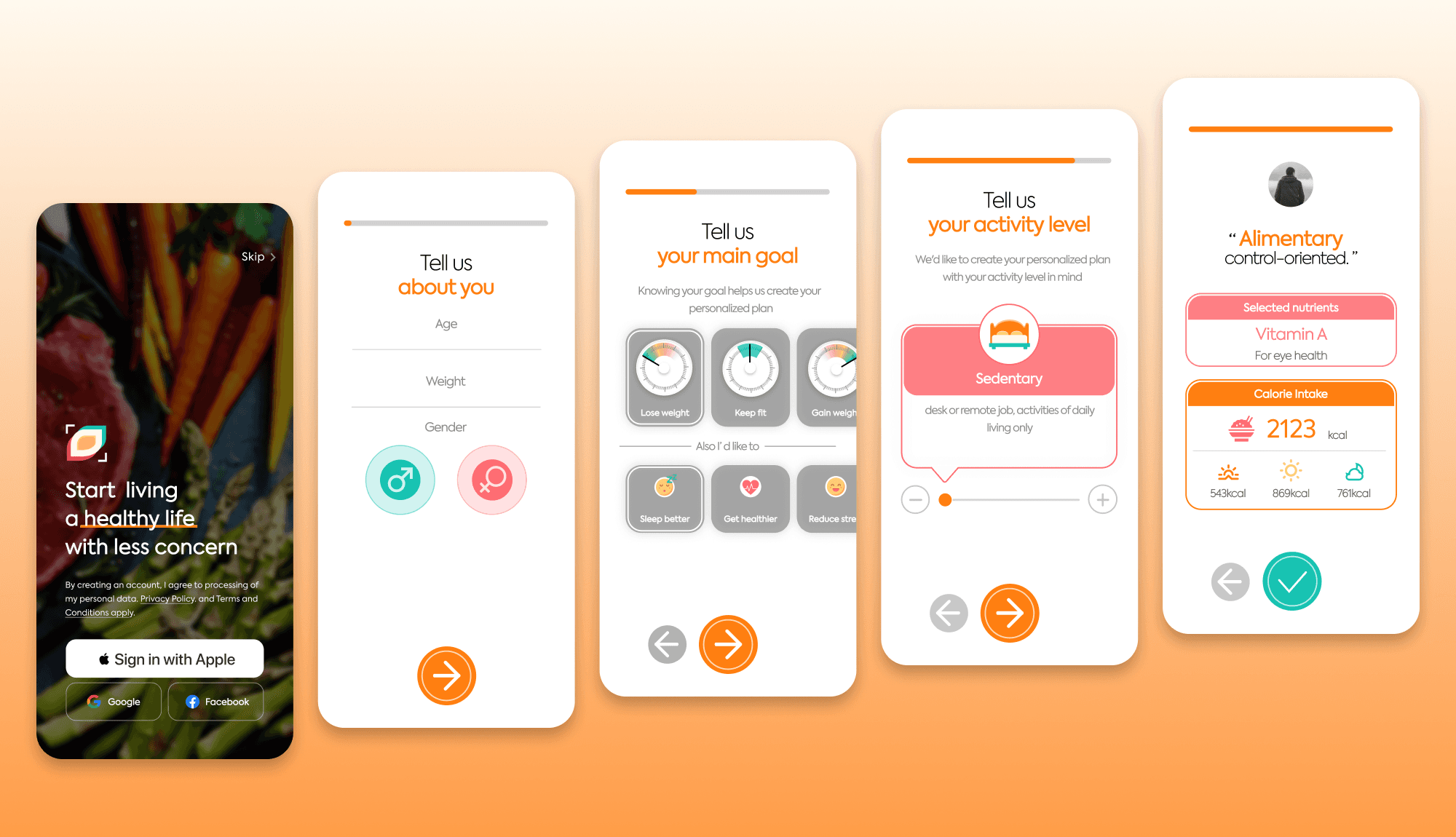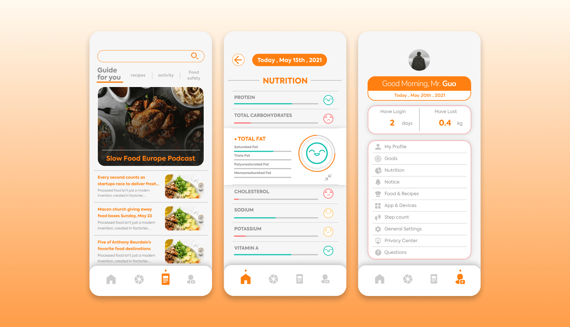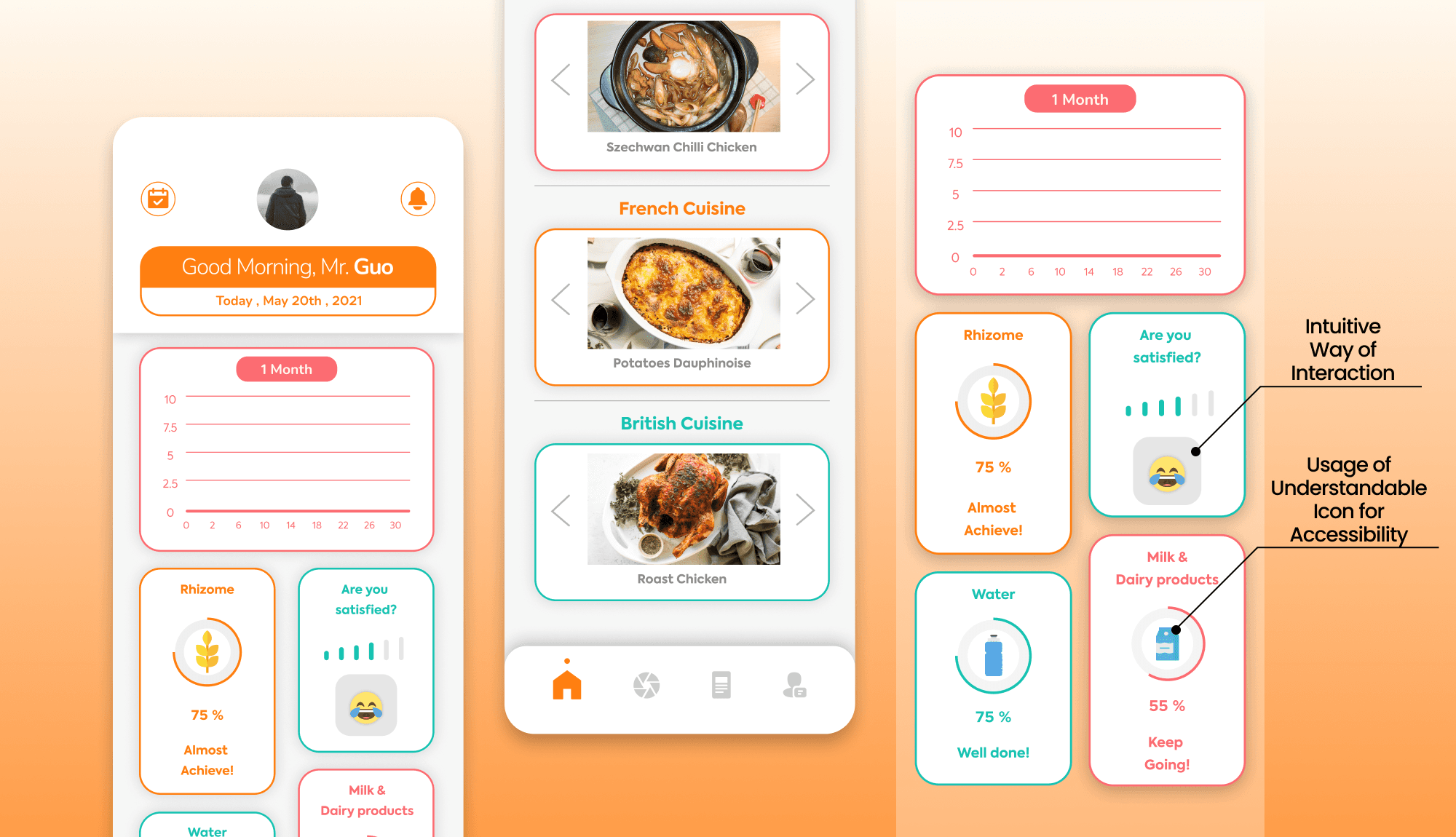 After discussing with potential users, I decided to use warm orange as the base colour, plus vibrant red and green, which represent health and vitality respectively. For the image, I used a logo that looks like a ‘poached egg’, which means that a good morning is the beginning of the day, and I hope that users will not only manage but also feel hope in the diet plan.