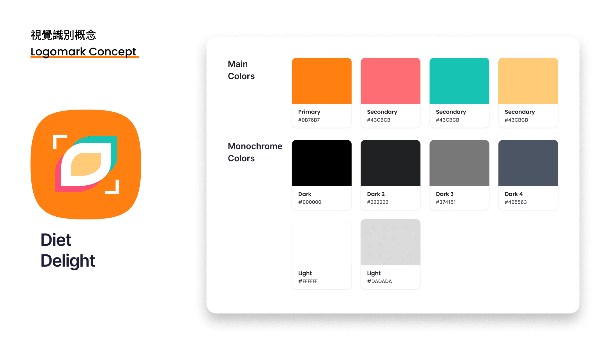 品牌識別上,希望傳達親和力與活力,讓每個人都能在飲食中找到樂趣與價值。 不論是希望增重、減重,或是維持現狀,都能在 Diet Delight App 中找到適合的方案。