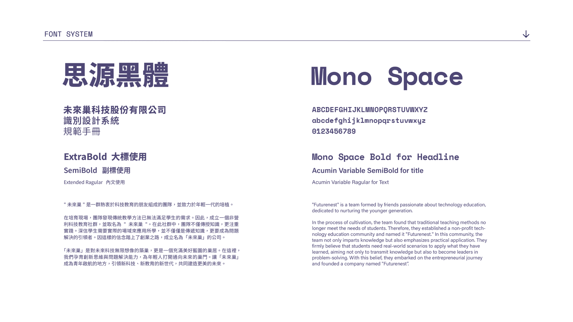 " 未來巢" 作為跨足科技& 教育的新創科技公司,跳脫於大家對於傳統的印象,從標準字的設計中,特別選用" Space mono " 字體,凸顯工程師/ 設計師技術驅動的專業團隊。此外,更從顏色著手,將活潑、親近的印象以鮮明的色彩呈現,希望給客戶耳目一新的感受,將品牌重塑一同聚焦於更加大膽前行與追求卓越的精神之上。