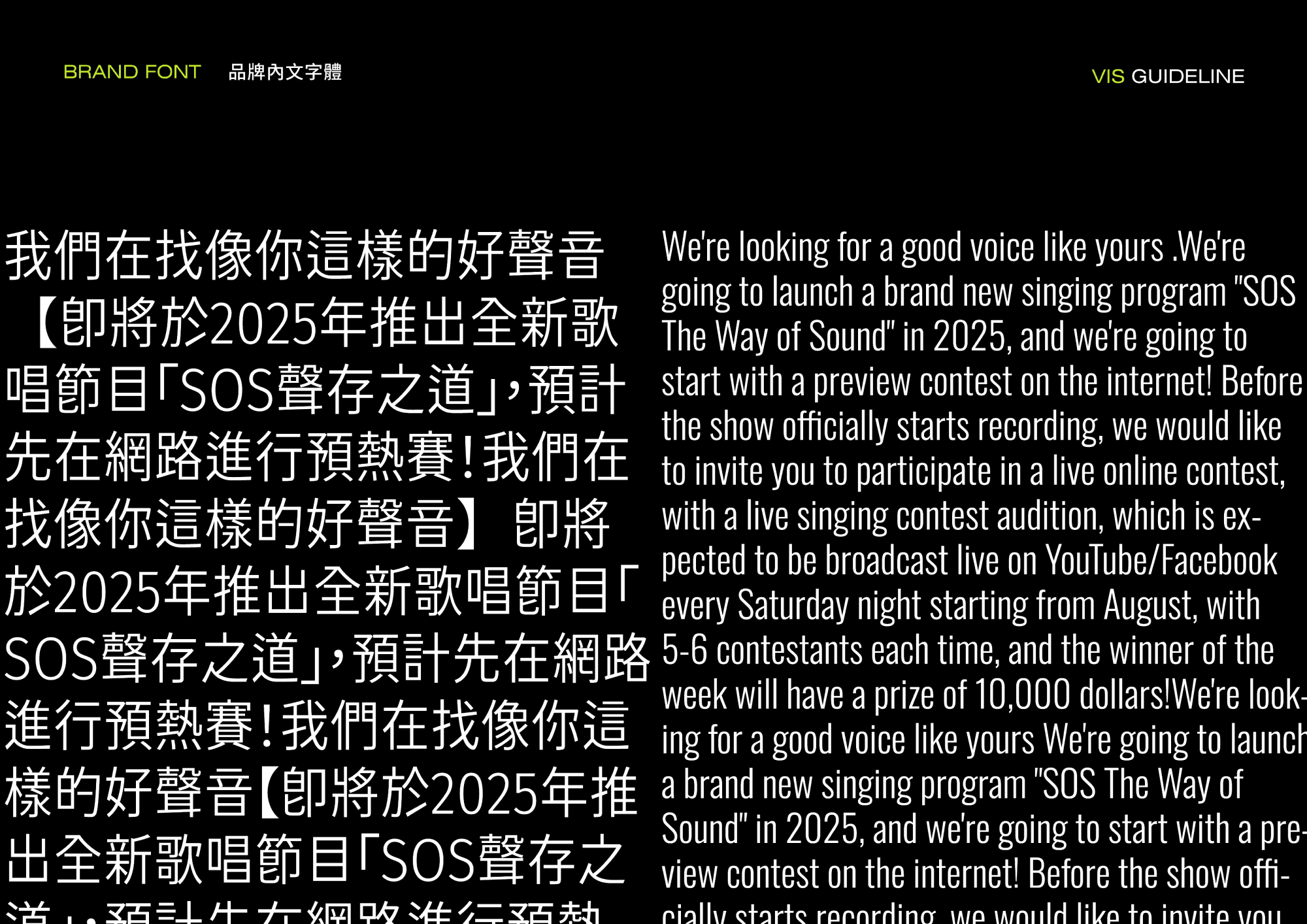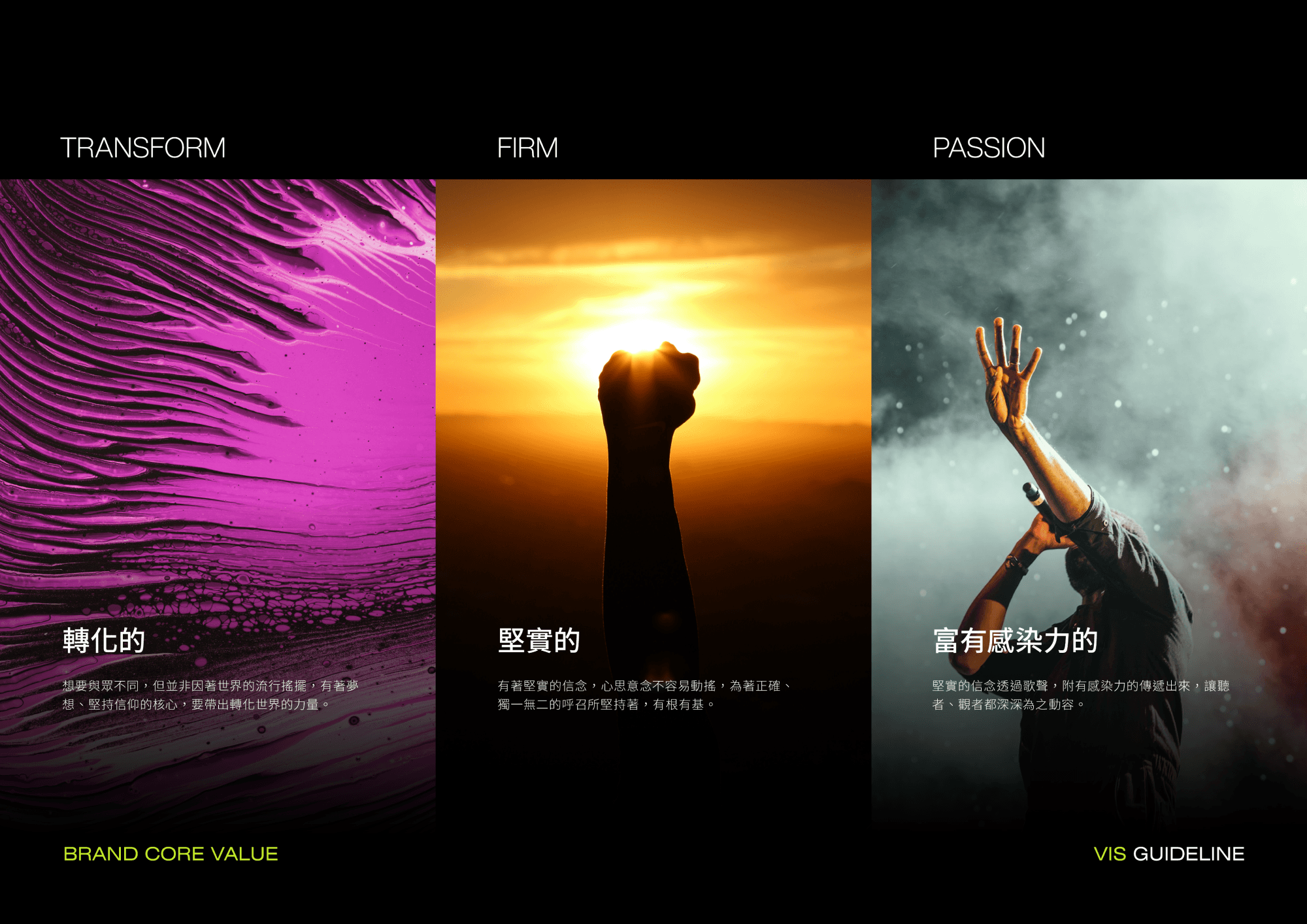 藉由品牌策略,將信仰的力量埋入到娛樂產業當中,高標準、高規格的理念規劃,深入影響到節目的方方面面,視覺呈現更是忠於強而有力的得勝宣言。