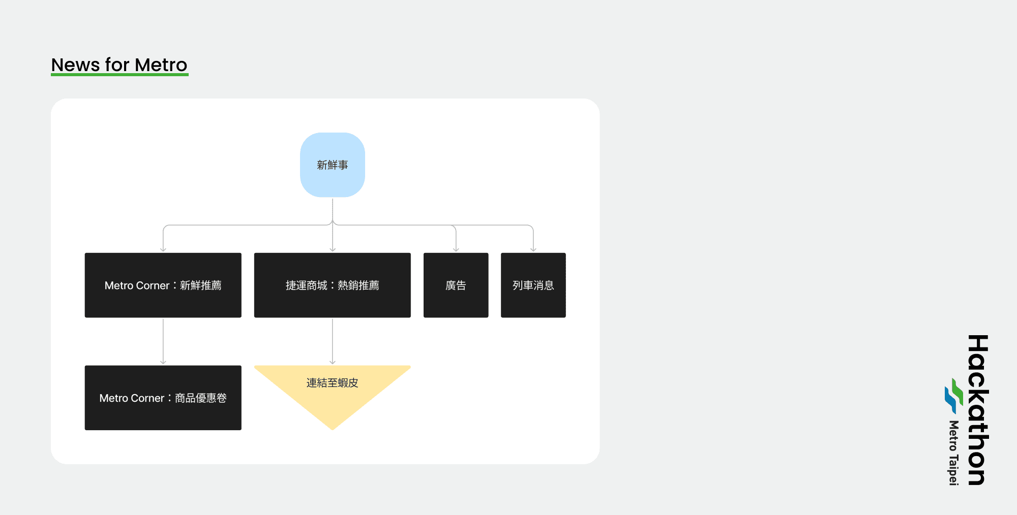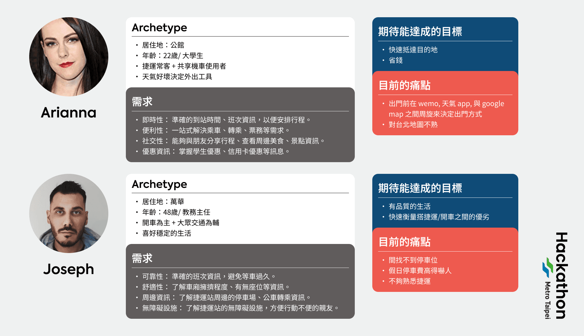 在搭乘台北捷運時,身為一般通勤族的我們對於 App 的需求其實不高;而在調查之後,發現 App 的價值在於服務特殊需求,像是身心障礙人士與運動愛好者等,想經由這次 App 的重新規劃,讓體驗優化的同時,服務到一般通勤族。
