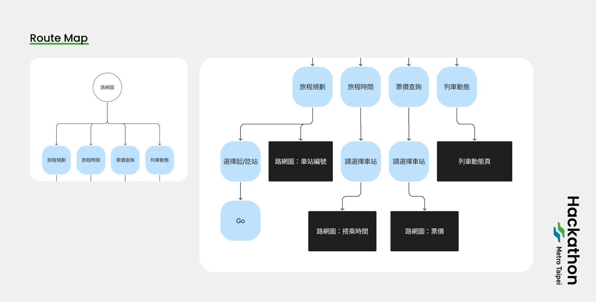 整理資訊架構後,我選擇將搭車最相關的四個功能(旅程規劃、旅程時間、票價查詢、列車動態)整合進「路網圖」子頁中,將票價查詢功能加入多人票價計算。