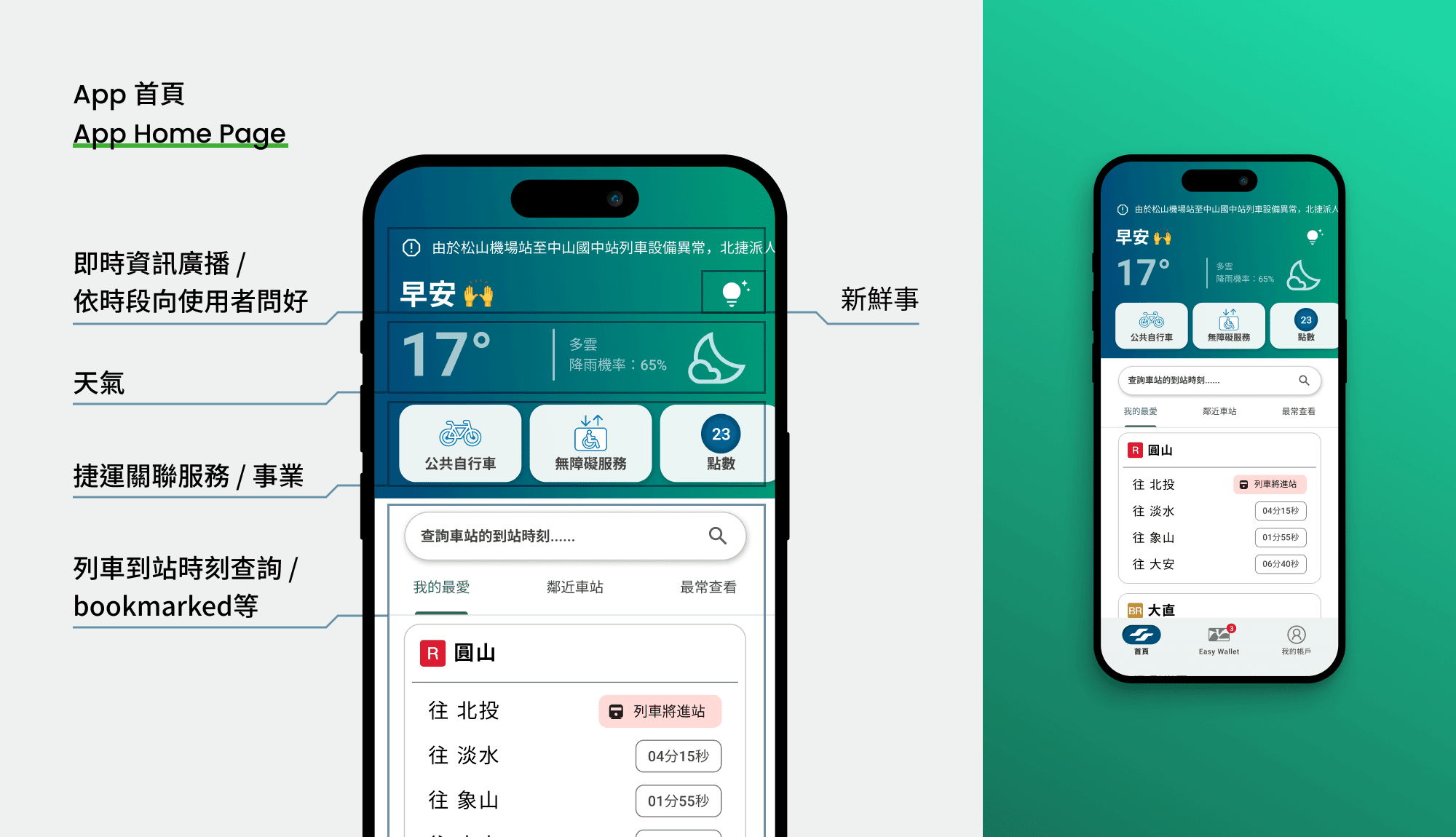 重新設計後,首頁留下列車到站時刻、捷運關聯事業,並新增即時天氣資訊以對應通勤族的需求。將最核心的搭車改由整頁「向右滑」進入,減少進入的流程。原有的線上商城/ 廣告由於成效不佳,改由「新鮮事」取代,提高內容質量。