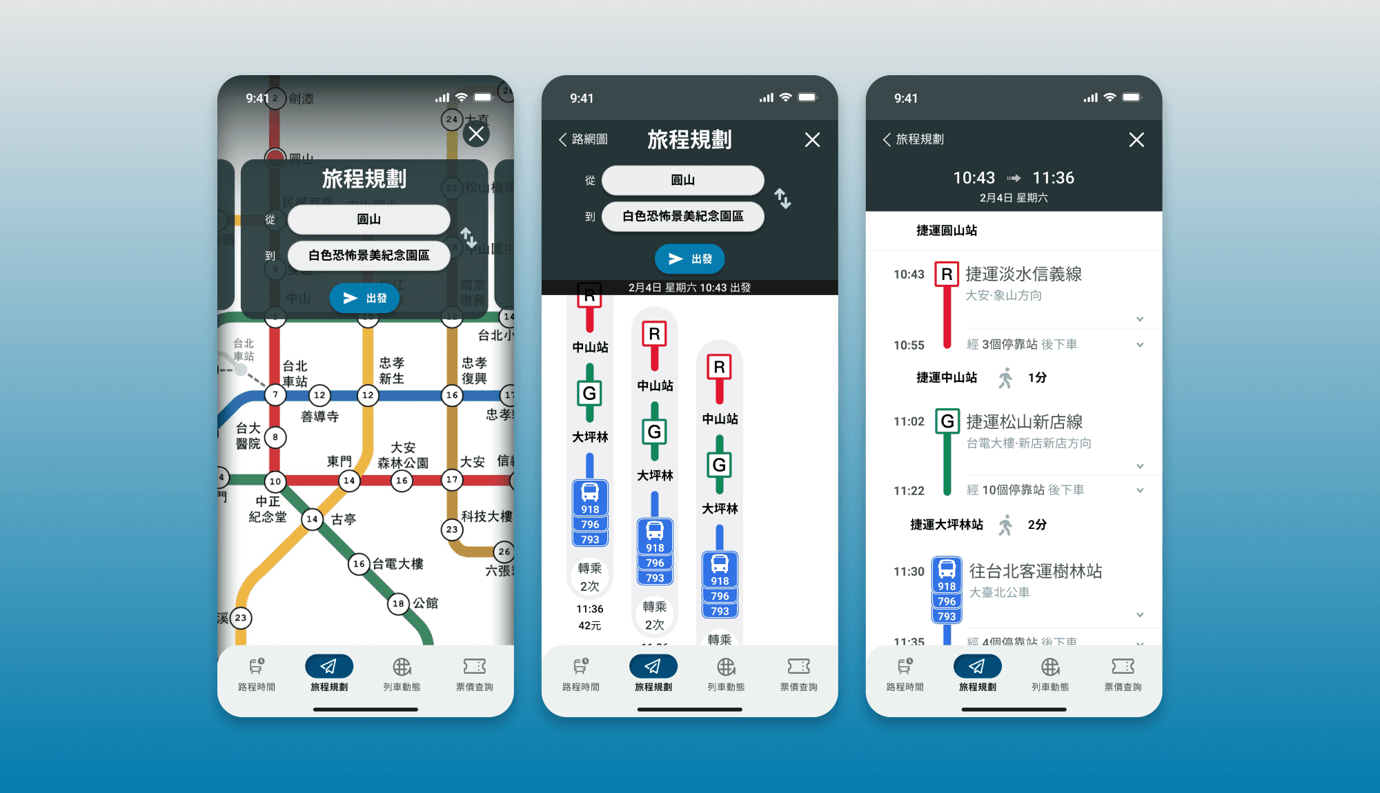 在原有的旅程規劃中,資訊顯示過於密集,字級顯示上也不夠清晰,在這裏以「時間帶」的排版重新呈現。除了捷運本身的交通網,更整合大眾運輸資源,提供多樣化的旅程規劃,點進時間帶後,更可以查看行走路線的引導。